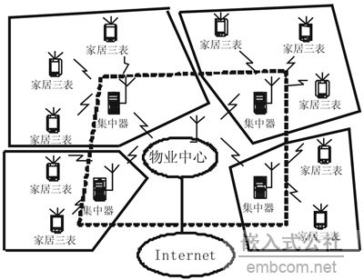 隨著電子技術、計算機技術和通信技術的不斷發展,各個行業的自動化進程正在逐漸加快,以至于在自動抄表中對數據采集的實時性、可靠性、信息量提出了更高的要求。目前的抄表系統主要有:有線抄表系統,掌上抄表系統和無線抄表系統.其中有線抄表系統增加了綜合布線的費用和難度,降低了系統的應用靈活性,限制了有線抄表系統的推廣和應用。掌上抄表系統需抄表部門用掌上抄表器抄取數據,因此降低了自動化程度。無線抄表系統采用無線收發設備傳輸數據,不需專門架線,系統結構簡單,節省了人力和物力,相對有線抄表系統和掌上抄表系統有著更大的優勢。本文提出了一種基于無線網絡技術的無線抄表系統,重點研究了基于nRF2401的無線通信的集中器的設計,通過該集中器可以實現采集數據快速、可靠的傳遞。 無線抄表系統方案 智能小區無線抄表系統主要由三表數據采集終端、集中器和物業中心的計算機組成。三表數據采集終端和集中器(下層),集中器和物業中心(上層)的計算機均采用星型結構。智能小區無線抄表系統結構如圖1所示。