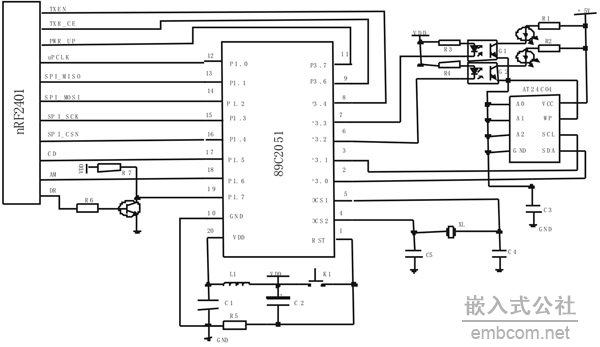 上層通過以nRF2401無線通信模塊與分散在小區內各棟樓內集中器上的nRF2401無線通信模塊相連接,形成1對多的連接形式,實現集中器和小區物業中心的計算機的實時在線連接。下層通信包括集中器通過無線的方式對三表數據的采集、存儲、轉發,以及轉發上位機下達的指令和對三表進行控制操作等。集中器是整個無線抄表系 統的通信橋梁,它的工作情況決定了系統的可靠性和穩定性,其實現功能有:每個月按約定時間循環查詢終端三表的數據,并把采集到的數據進行累加保存起來;當 接收到物業中心的計算機發布的采集命令后,立即打包數據并傳送;也可主動向物業中心的計算機發送數據、報告緊急情況等。 集中器硬件設計 在無線抄表系統中,集中器處于信息傳遞通路的中間位置,該系統中的集中器采用無線方式傳輸數據,是整個系統的核心。無線數據集中器主要有無線數據傳輸模塊nRF2401、外部存儲單元、本地通信接口、微處理器(MCU)和電源模塊等組成。數據集中器硬件結構框圖如圖2所示,數據集中器電路原理圖如圖3所示。