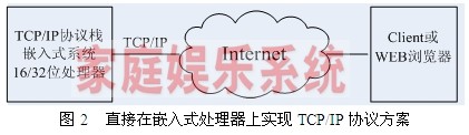 (2)通過直接在嵌入式處理器上實現TCP/IP協議來實現Internet接入功能這種方案沒有使用操作系統,大大節省了資源,但是對處理器的性能要求較高,同時增加了開發的難度,技術實現上也比較困難。如圖2所示。