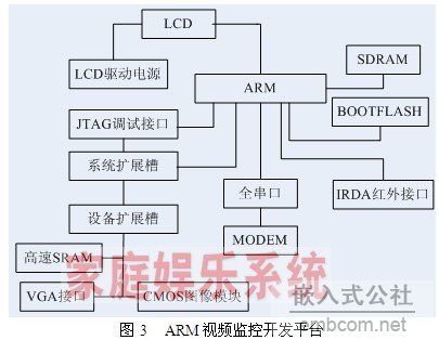 (3)采用一個基于ARM Linux 的網絡監控系統 這 種方案和第二種方案類似,但是它只用嵌入式ARM Linux 操作系統,在操作系統上運行TCP/IP 協議。目前大多數嵌入式操作系統都帶有TCP/IP協議棧,這降低了開發的難度,實現起來比較靈活。由于嵌入式操作系統的運行需要占用相當的處理器資源和 存儲器空間,對硬件配置也有較高的要求。采用第三種方案,可以節省開發時間、縮短開發周期。監控系統一般都還要在控制現場配置一臺工控機或高性能微機做服 務器,用來存儲中間數據,處理實時性要求較高的事件,響應監控終端的監控請求。 2 監控系統硬件設計 采 用基于ARM嵌入式的網絡監控系統,它采用TCP/IP網絡協議標準,系統組網簡單,傳輸數據量大,速度快,整個系統結構簡單。尺寸微小、價格低廉。遠程 計算機可做到無需額外程序,通過WEB瀏覽器就能對設備進行檢測,而且應用程序易于開發、實現信息的完整共享。在該系統中ARM負責程序控制和網絡通信, 圖像和視頻采集模塊負責數據獲取和處理。當數據或命令數據傳輸過來后,ARM系統進行命令處理后,將命令數據傳輸或顯示在LCD上,同時系統負責將處理的 結果經過網絡接口上傳出去。系統接收到數據命令后,經過算法處理后,驅動D/A輸出或根據A/D輸入進行數據處理后,將結果傳給ARM。系統具有以下幾個 基本功能:數據采集、數據分析和處理、程序控制、網絡傳輸。 2.1 ARM視頻監控平臺 如圖3所示為視頻監控應用系統的開發平臺。ARM的系統擴展槽和設備擴展槽,用于為ARM系統添加如以太網接口、?跀祿鎯涌诤蚉CMCIA等接口,或者用于其他的功能開發板,為ARM系統擴展了CMOS圖像獲取功能和VGA顯示功能。