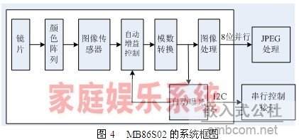 其中,VGA接口是通過電阻網絡實現4096色彩色顯示。與SRAM訪問相關的寄存器有:SDRAM控制寄存器、讀地址低16位、讀地址高16位、讀出數據寄存器、寫地址低16位、寫地址高16位、寫入數據寄存器;與CMOS圖像采集有關的寄存器有CMOS采集控制寄存器、CMOS采集狀態寄存器;與VGA顯示有關的寄存器是VGA顯示控制寄存器。它具有以下特點: (1)實時性好,能滿足數據采集和數據處理的實時性要求。 (2)性價比高,在滿足要求的情況下,系統成本應盡量低。 (3)可控性好,能夠實現遠距離控制和數據傳輸。 2.2數據采集模塊 視 頻源信號來自于一個高集成度的CMOS數字圖像傳感器模塊MB86S20,它是富士通的產品。MB86S02不但集成了CMOS圖像傳感陣列、自動增益信 號放大器、模數轉換器,還包括了色彩信號處理和微型鏡頭,包含了圖像采集的所有前端處理,可以直接輸出數字信號。模塊的系統框圖如圖4。