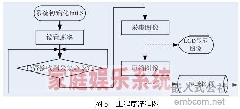 MB86S02是基于CMOS工藝,使用有源像素的傳感器,與傳統的CCD傳感器相比有如下不同點。 (1)成像過程 ccd和cmos使用相同的光敏材料,因而受光后產生電子的基本原理相同,但是讀取過程不同:ccd是在同步信號和時鐘信號的配合下以幀或行的方式轉移,整個電路非常復雜,讀出速率慢;cmos 則以類似 dram的方式讀出信號,電路簡單,讀出速率高。 (2)集成度 采 用特殊技術的ccd讀出電路比較復雜,很難將a/d轉換、信號處理、自動增益控制、精密放大和存儲功能集成到一塊芯片上,一般需要 3~8 個芯片組合實現,同時還需要一個多通道非標準供電電壓。借助于大規模集成制造工藝,cmos圖像傳感器能非常容易地把上述功能集成到單一芯片上,多數 cmos圖像傳感器同時具有模擬和數字輸出信號。 (3)電源、功耗和體積 ccd需多種電源供電,功耗較大,體積也比較大。cmos只需一個單電源(3v~5 v)供電,其功耗相當于ccd的1/10,高度集成cmos芯片可以做的相當小。 (4)性能指標 ccd 技術已經相當成熟,而 cmos正處于蓬勃發展時期,雖然目前高端cmos圖像質量暫時不如ccd,但有些指標(如傳輸速率等方面)已超過ccd。由于cmos具有諸多優點,國 內外許多機構已經應用cmos圖像傳感器開發出眾多產品。本文主要介紹已商品化的cmos圖像傳感器的發展現狀以及最新發展動態,希望對下游產品的開發有 所幫助 CMOS技術的最大優點是每一個像素單元可以集成一個或多個晶體管,這樣就具有了低功耗和小型化的優點,非常適用于手持設備,可以降低系統功耗、體積,提高電池效率;它的高度集成性大大簡化了圖像應用系統的設計。 MB86S02的主要特性如下: 嵌 入式處理器通過與MB86S02 CMOS圖像模塊的連接,讀取圖像數據后通過同步SRAM接口存儲在外部高速SRAM中,然后還可以由UART模塊或RTL8019模塊把已經存儲的圖像 數據發送到PC,最后PC上的接收程序將顯示接收的圖像。通過調試板上的按鍵可以選擇采集圖像、地址復位、串口發送、網口發送這幾種功能。 3 監控系統軟件設計 如圖5所示是ARM主程序流程圖。ARM處理器獲取圖像信息,執行壓縮程序,壓縮后的文件通過公共電話線路傳遞到監控主機端。由于系統采用相同的圖像分辨率和常量表,所以文件頭都相同。為了減少傳輸數據量,不傳送文件頭,文件頭在監控主機端由軟件自動添加。